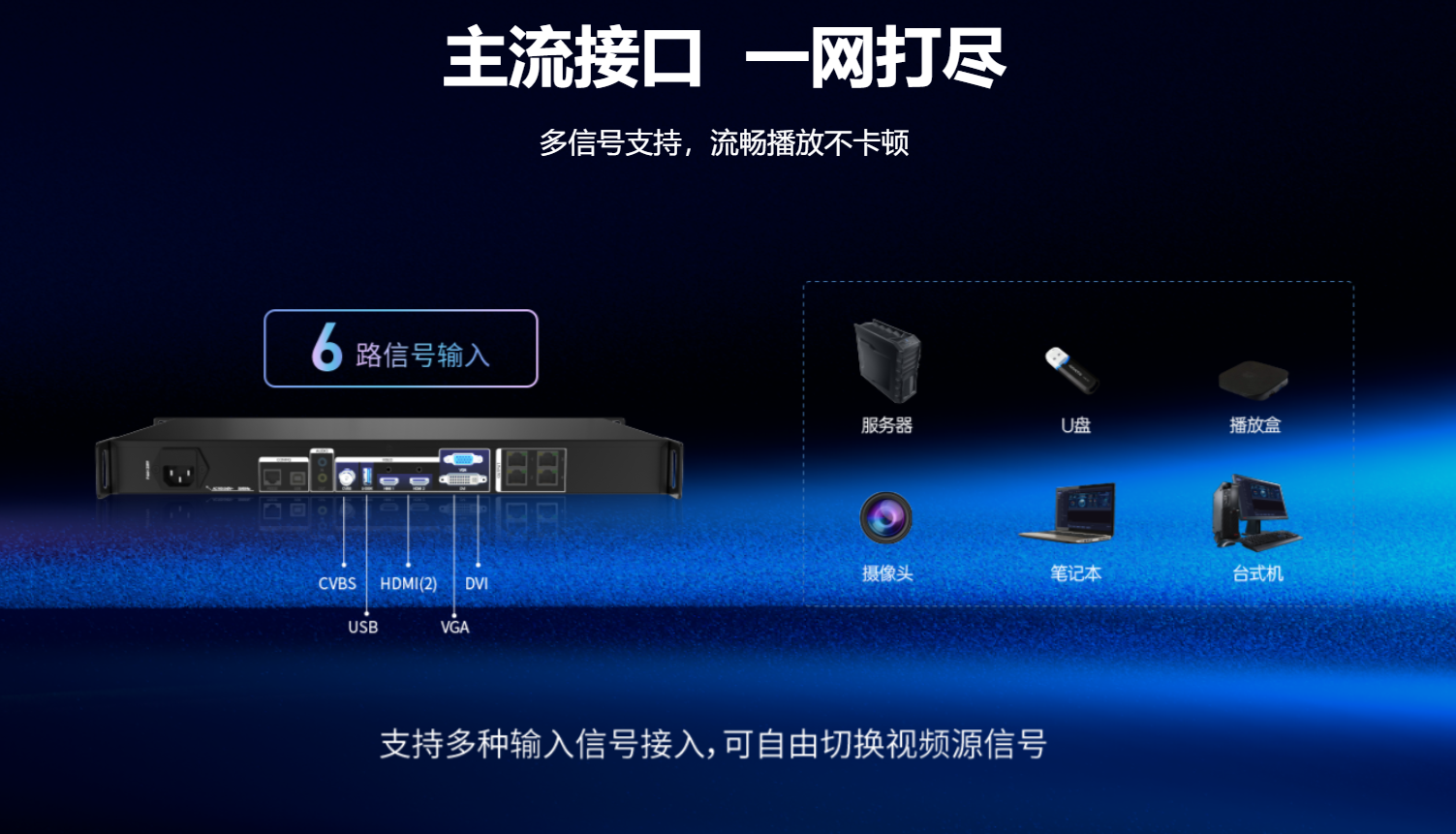三款控制器均支持1920×1200@60Hz高清数字信号输入,覆盖HDMI、DVI、SDI等主流接口,满足从4K到8K级超宽屏的显示需求。其中,APG-KLT-X6更以6路千兆网口输出的顶级配置,单机可驱动8192×4096像素的巨型显示屏,相当于16块4K电视无缝拼接,为大型场馆、智慧城市等场景提供无损画质保障。